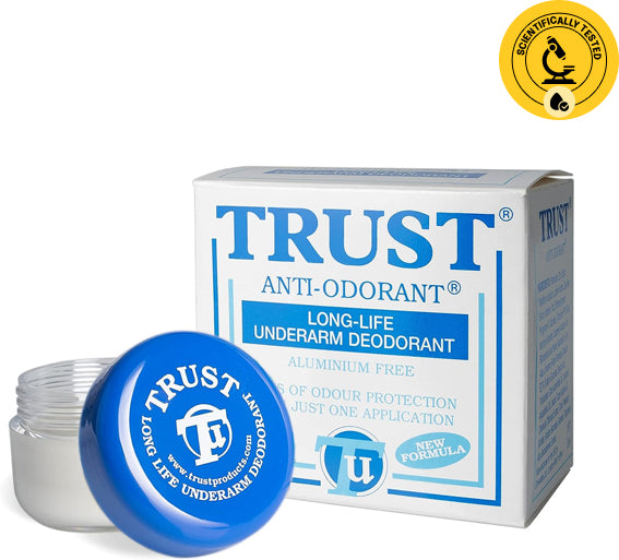 Based on years of research, a formula was developed which dealt directly with the cause of our body odour - the bacteria itself - rather than masking the smell as with ordinary deodorants. Trust reduces the effect of bacteria and thus eliminates the odour for several days. Protection can last between 3 and 6 days, depending upon the individual.